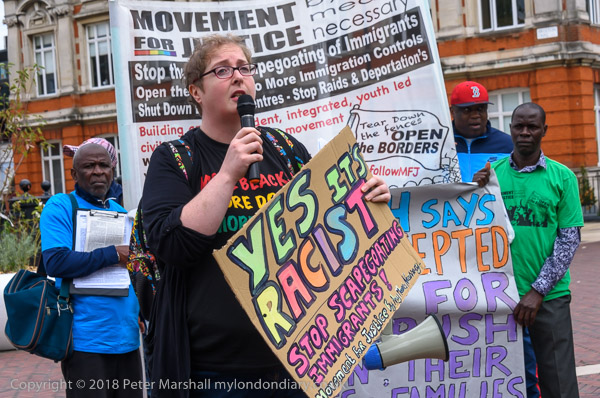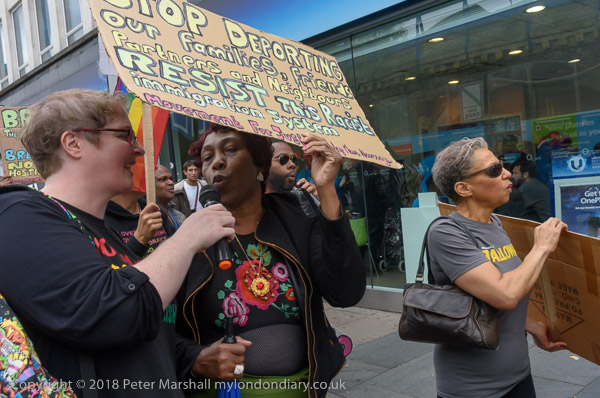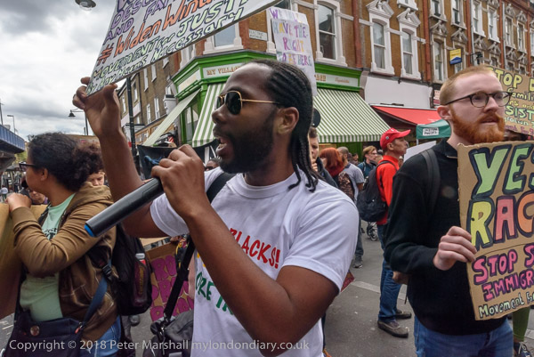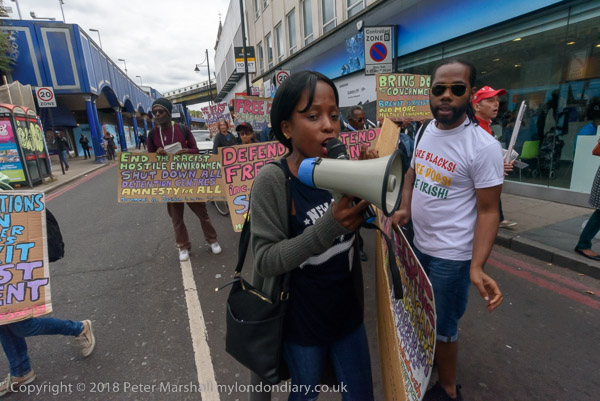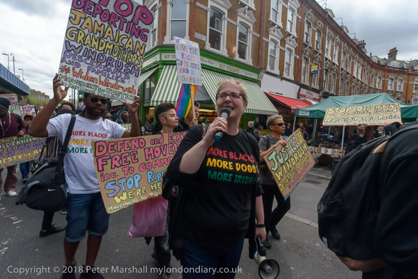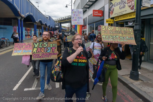 Karen Doyle leads some chanting at Brixton Market