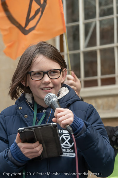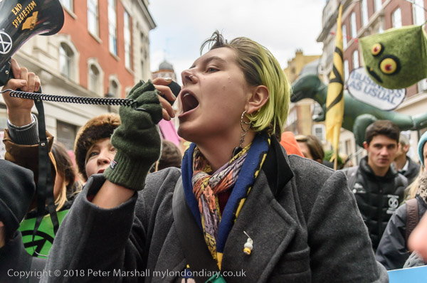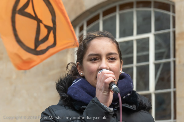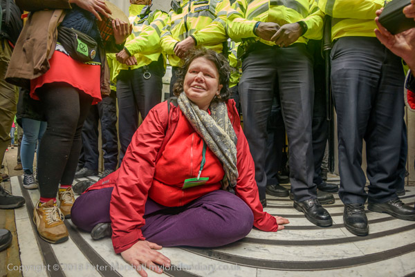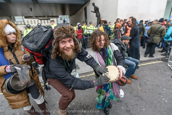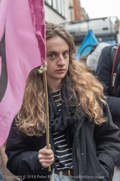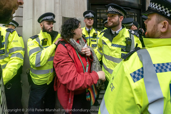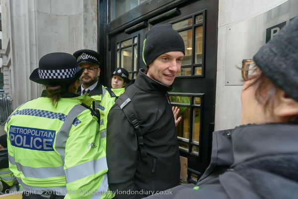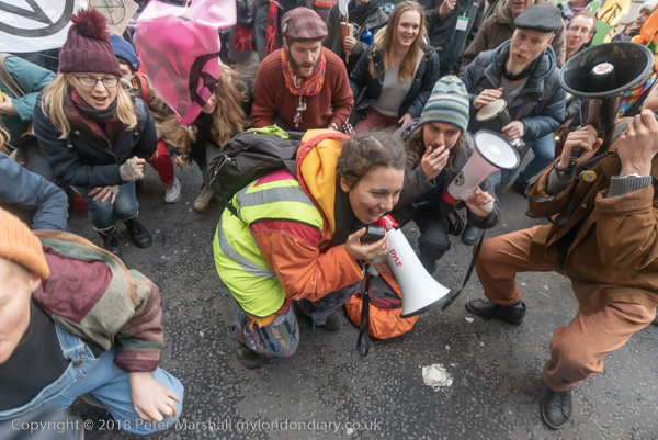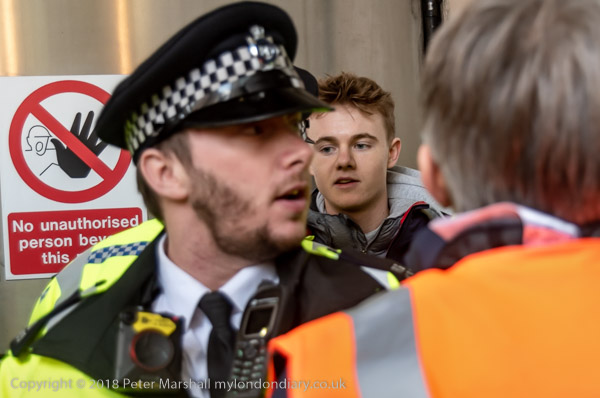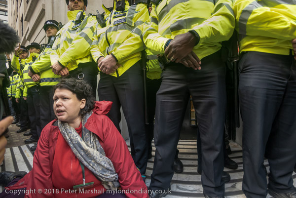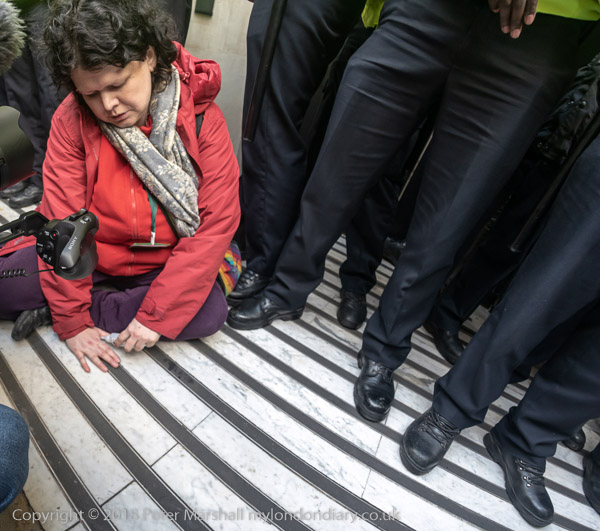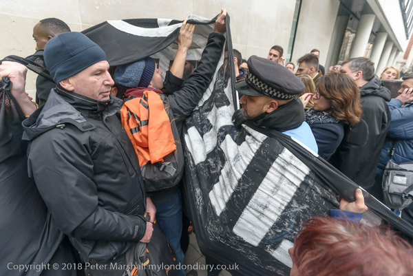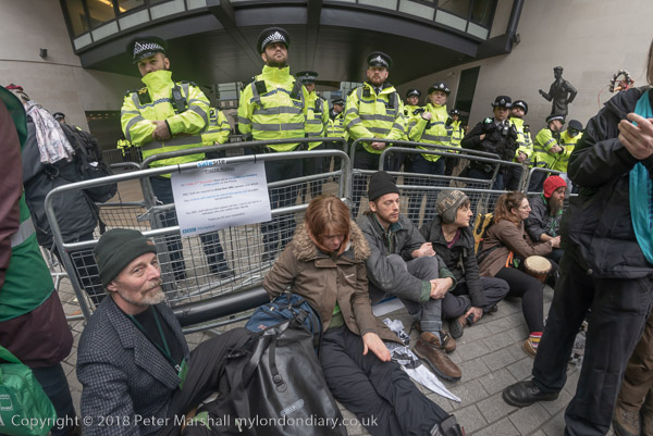 BBC workers coming back from lunch have to squeeze past the XR banner