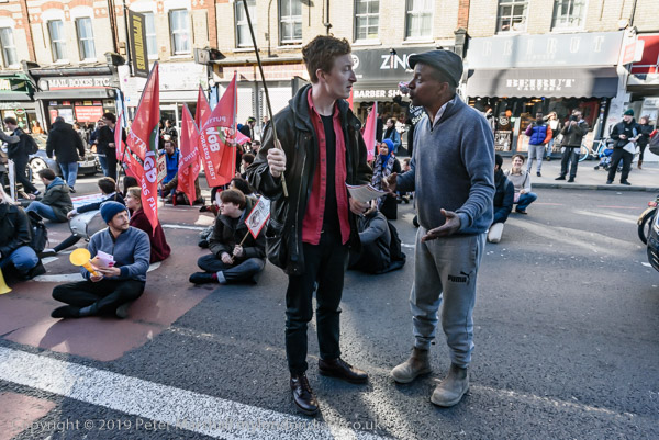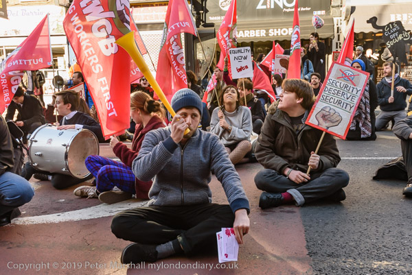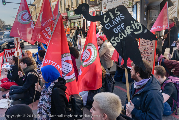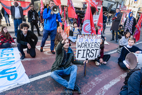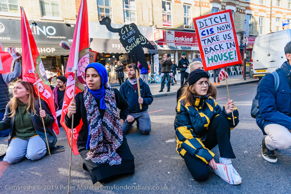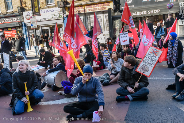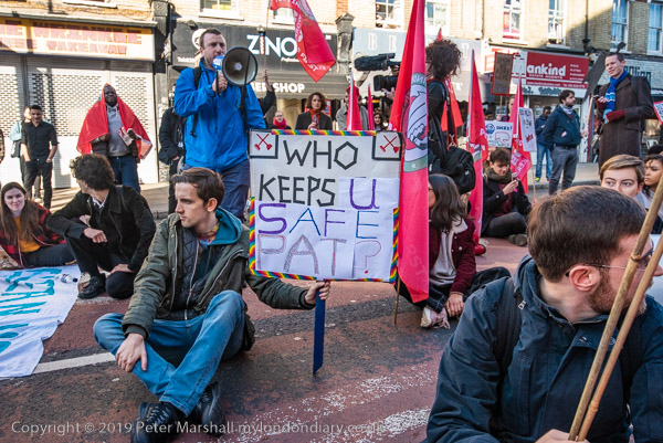 Protesters sit on New Cross Road outside Goldsmiths Management offices
