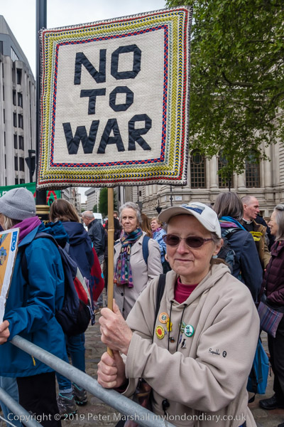 'Not in My Name' and on the other side 'No To War' on a hand-embroidered