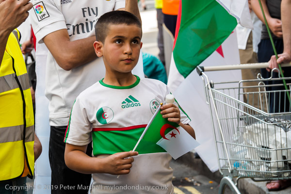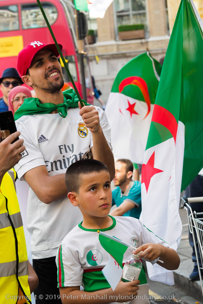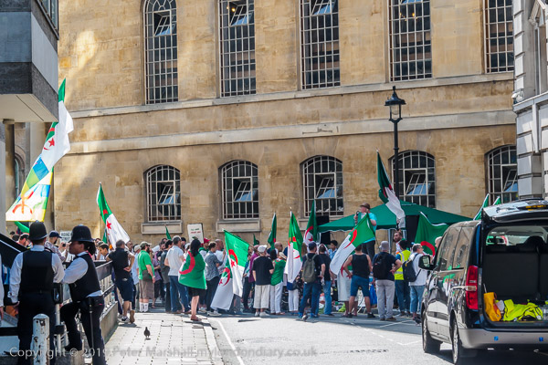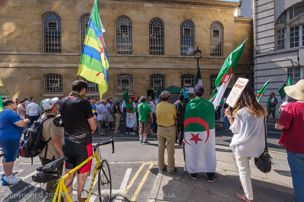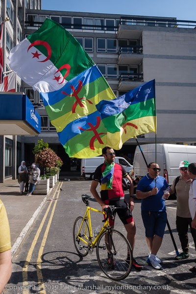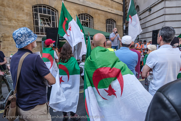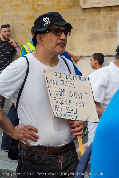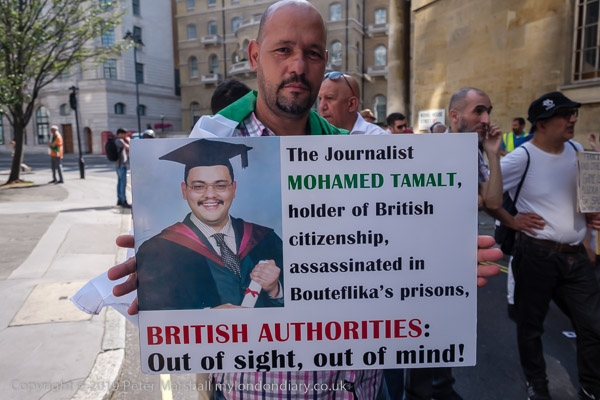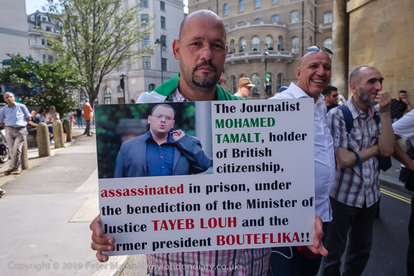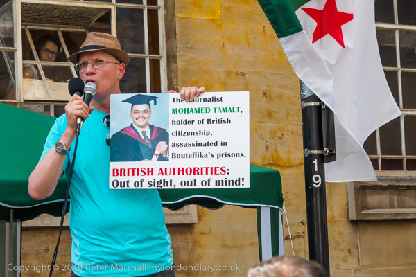 A man speaks holding a poster about Mohamed Tamalt, a British citizen