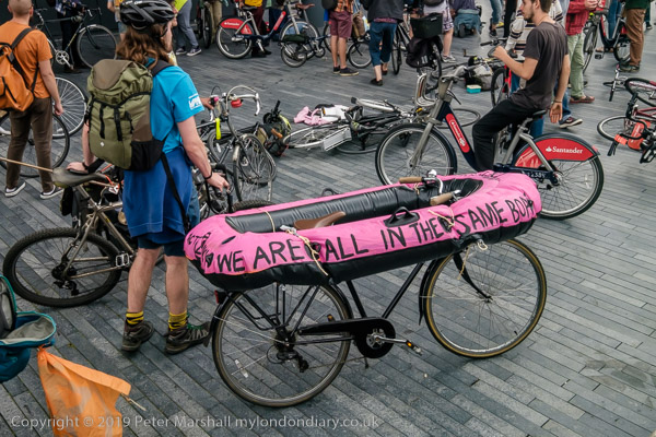 The pink hybrid boat/bike with the message 'We Are All In The Same