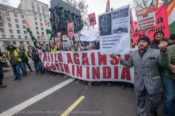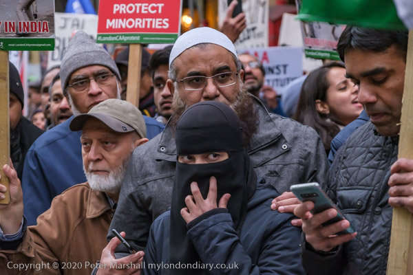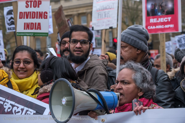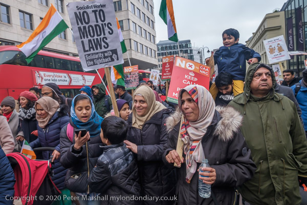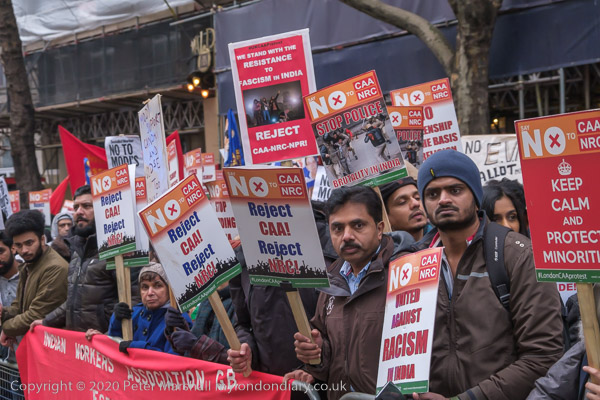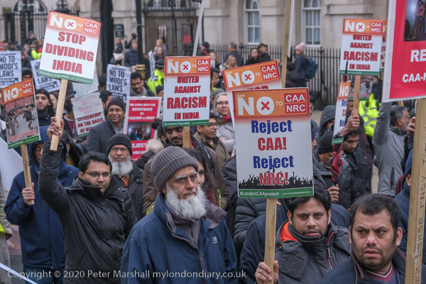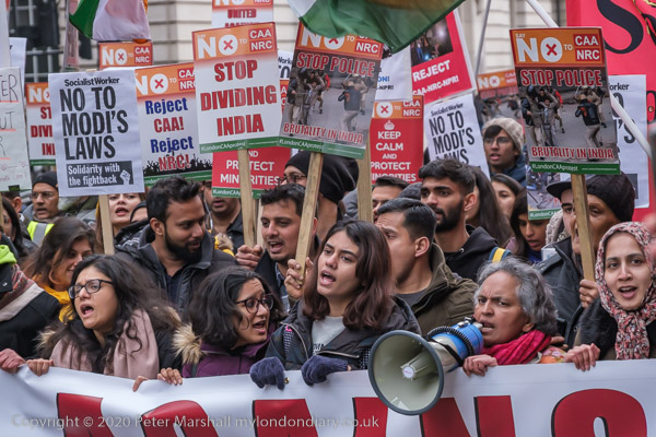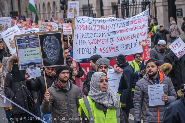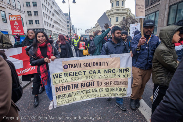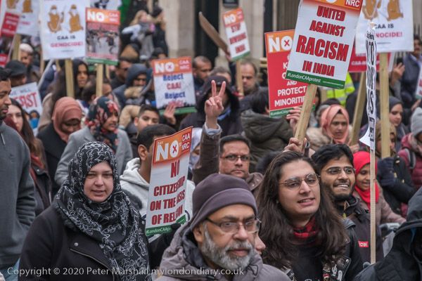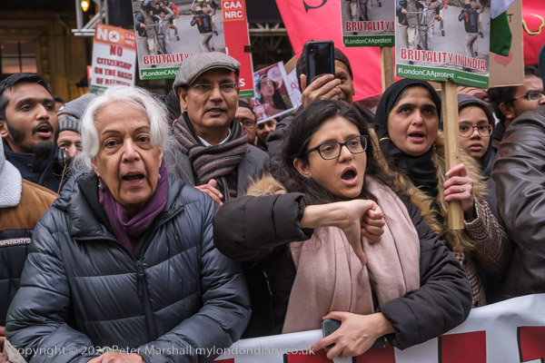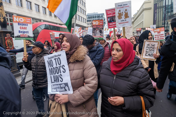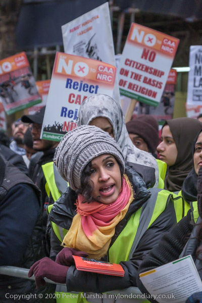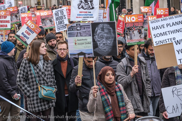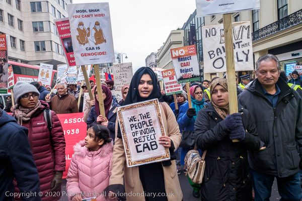 A woman carries a placard about the CAB (now passed and so the CAA)