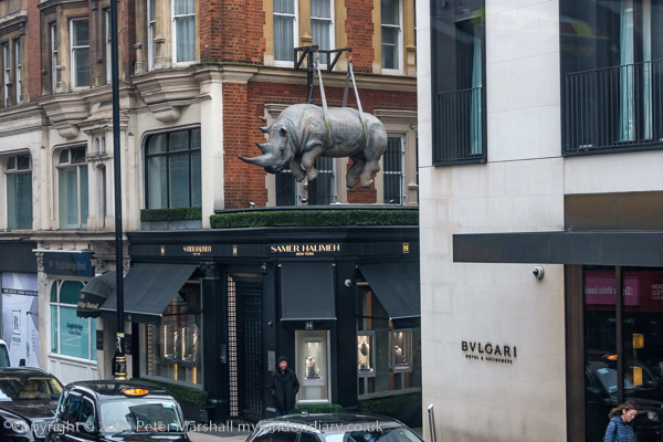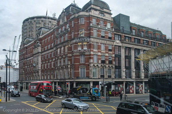 The bus turns down Sloane St, with Harvey Nichols on the corner